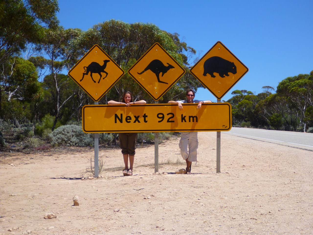 Voici un célèbre panneau australien, l'unique du pays indiquant la présence simultanée de ces 3 animaux. C'est le début d'une longue route au travers de la Null Arbor Plain (1000kms), plaine désertique sans arbres (du latin \"Nullus Arbor\"), ou la route en ligne droite (un virage tout les 25 kms en moyenne) fait de temps en temps office de piste d'atterrissage de secours (cf : gallery)...