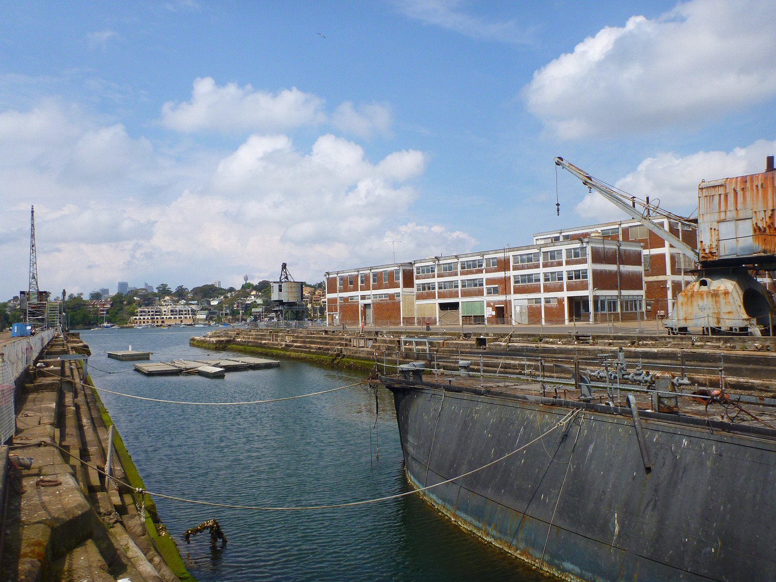 Histoire de rentabiliser notre pass, nous avons repris le ferry samedi malgré le temps menaçant. Cette fois-ci, direction Ouest, nous nous sommes enfoncés plus profondément dans le Port de Sydney (qui rentre des kilomètres dans les terres), et avons atteint la plus grande ile du port : Cockatoo Island. Cette ile, qui ne paraissait pas terrible sur le papier, s'est avéré très agréable et intéressante. C'est une ile qui a hébergé successivement une prison, puis un chantier naval, et qui est ouverte au public depuis 2007. On peut donc aller y pique-niquer, et y visiter les vestiges du chantier naval. Il est même possible de louer une tente sur cette ile paisible, pour $60 la nuit!