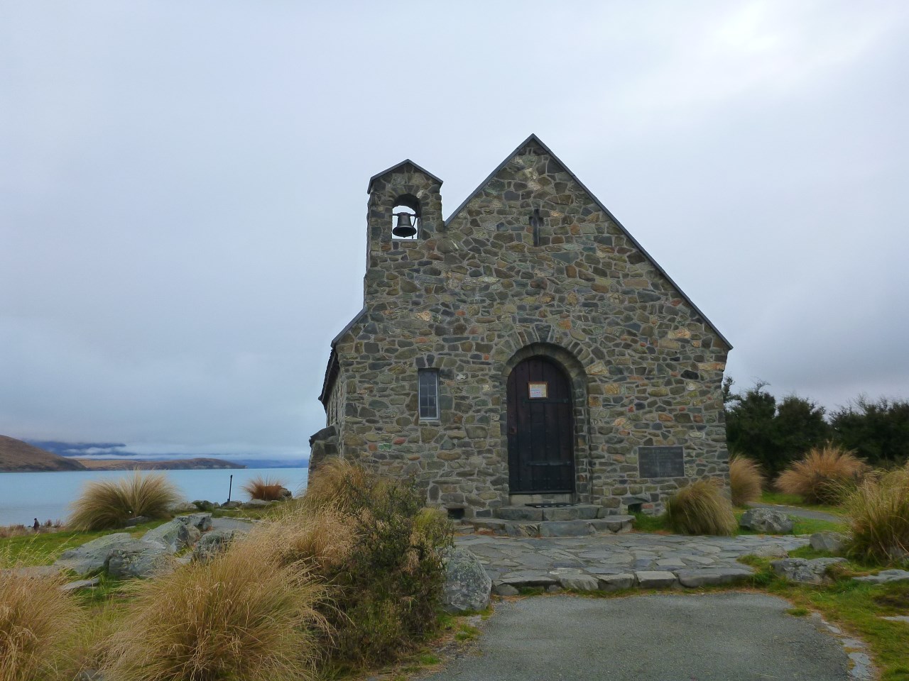 Ce lac (ici en arrière-plan) est réputé pour son incroyable couleur turquoise... Malheureusement, après 3 jours, nous n'avons toujours pas vu le soleil, ce qui rend les photos un peu ternes... En photo au premier plan, l'église du Bon Berger, qui surplombe le lac. Elle a été érigée en 1935.