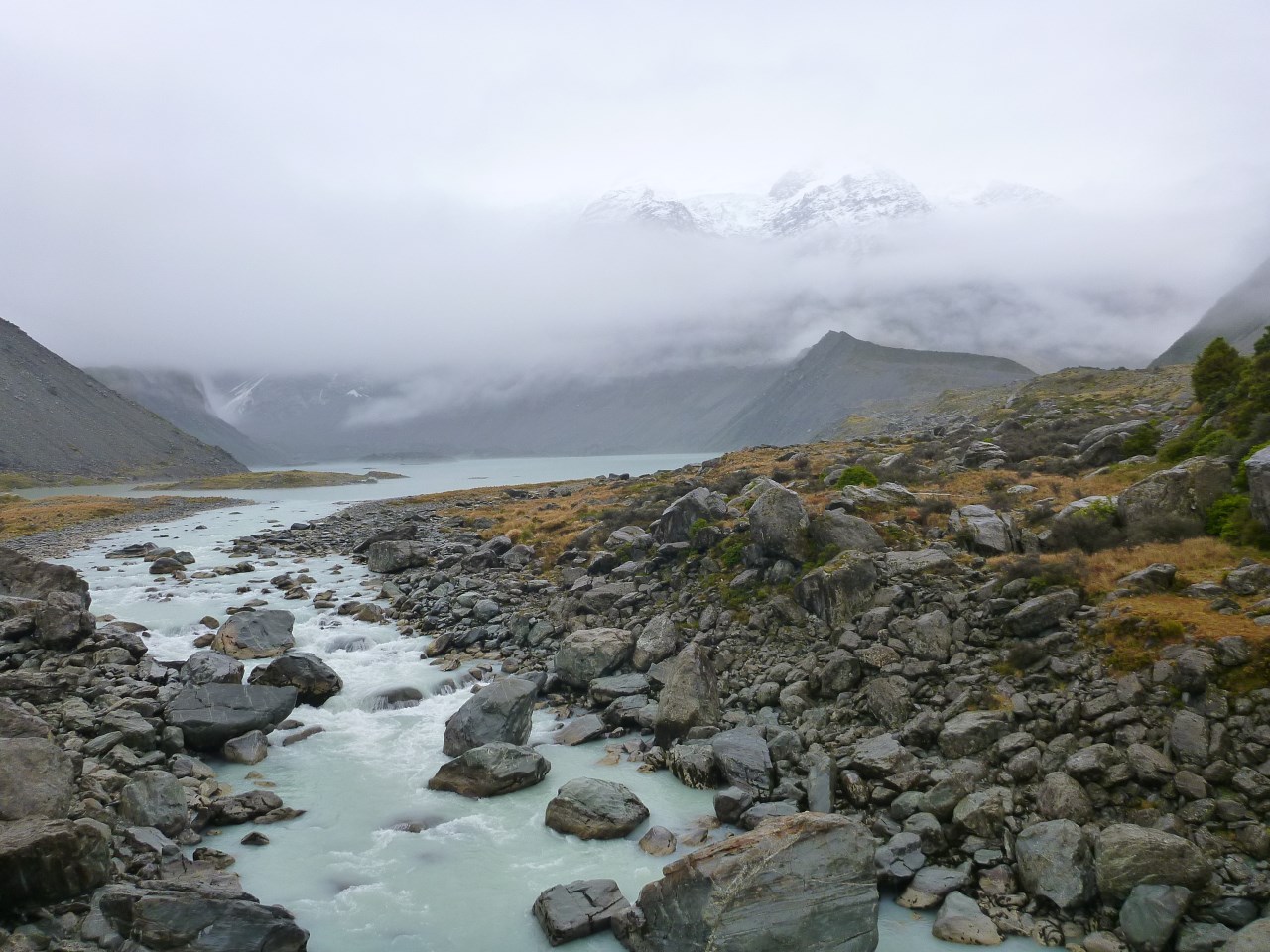 Plus haut sommet de Nouvelle-Zélande (3754m), le Mont Cook attire les aventuriers du monde entier. Nous nous sommes contenté d'une balade de 30 minutes à son pied, la pluie nous douchant pour le 4eme jour consécutif... Nous n'avons donc qu'entre-aperçu le Mont, sans en voir le sommet.