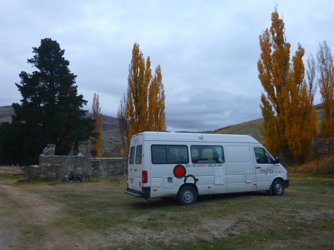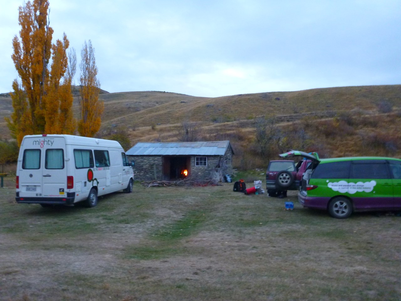 Nous avons passé une nuit dans la montagne, sur le site de l'ancien Hotel de Lindis Pass, aujourd'hui en ruine (il date de la ruée vers l'or). Son jardin est de nos jours reconverti en lieu de camping sauvage autorisé. L'accès étant difficile, les visiteurs sont peu nombreux. Pour notre part, nous y avons rejoint nos amis de Cable Bay en vadrouille : Pierre et Amandine, Rolf et Zsa-Zsa, et Laurent. Une vieille bâtisse en pierre nous a servi d'abri pour la soirée, avec sa cheminée en état de marche.