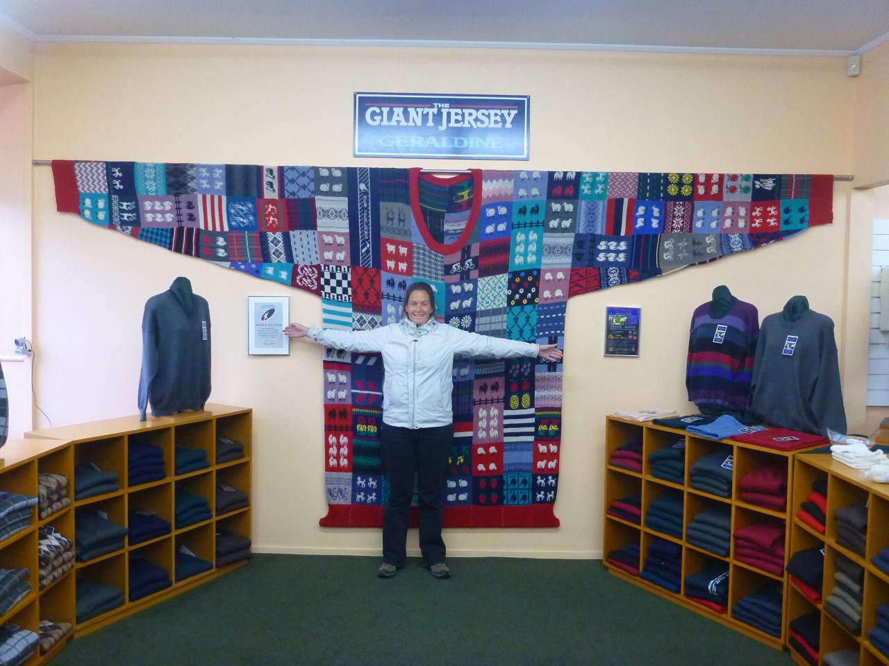 La ville de Géraldine offre quelques curiosités. Après une dégustation de chutneys, confitures, fromages, et sirops, nous nous sommes arrêtés dans la petite boutique qui revendique haut et fort sa présence dans le livre des records, grâce à ce magnifique jersey tricoté main par les patrons.