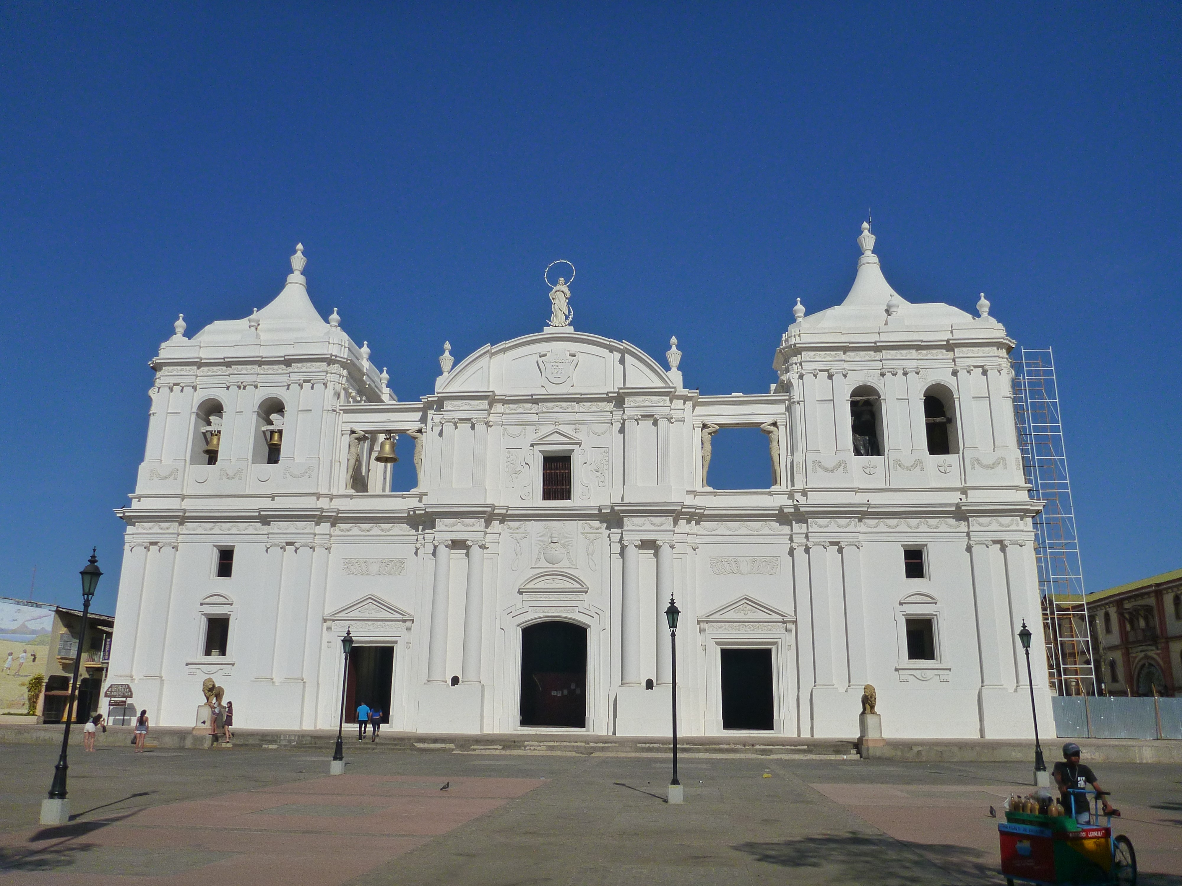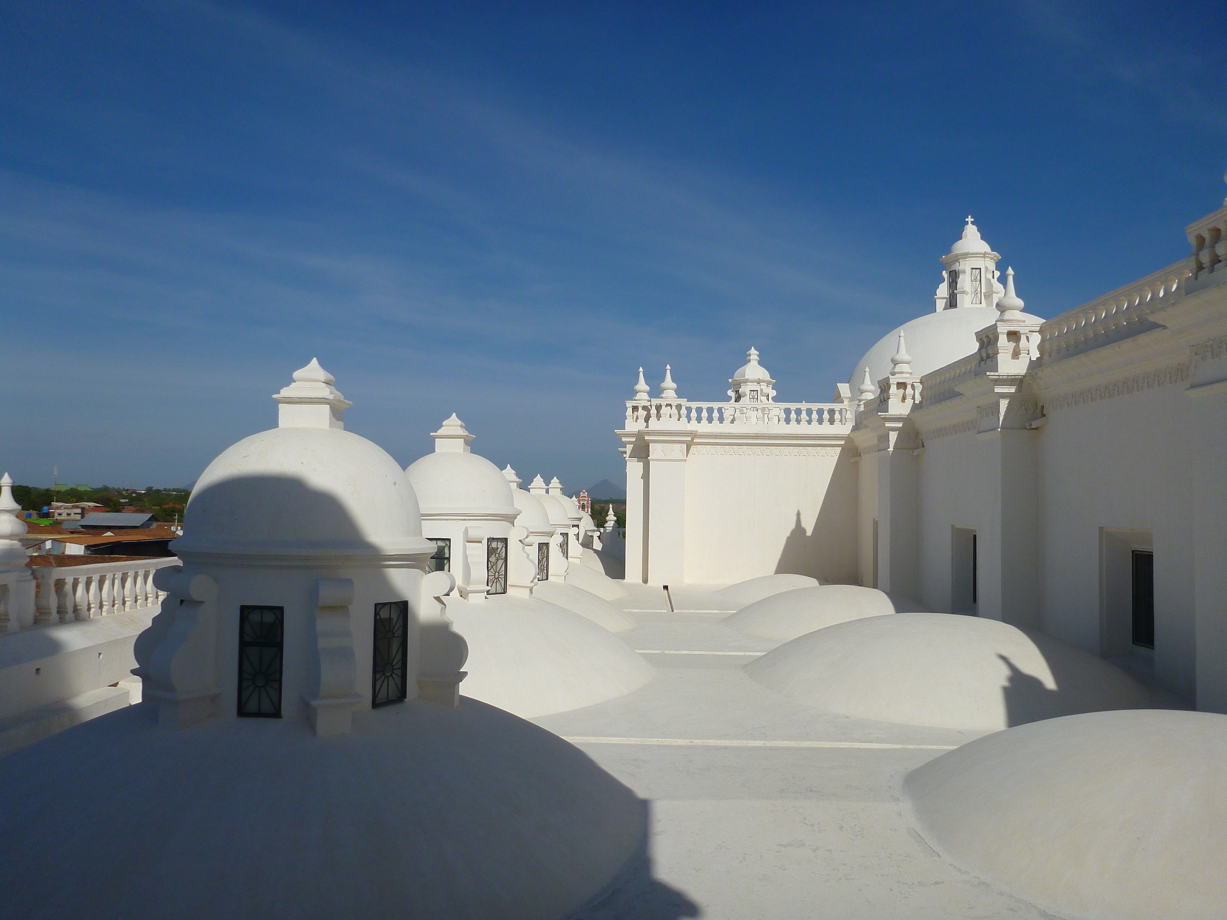 Nous voilà donc dans cette ville coloniale, au nom complet de Santiago de los Caballeros de León, au Nicaragua. Nous avons passé un dimanche reposant après notre périple, à flâner dans la ville sous le soleil et ses 38°. Parmi les édifices remarquables, on compte plus de 19 églises dans la ville, dont la fameuse Cathédrale-basilique royale de l'Assomption de la Bienheureuse Vierge Marie (ou Cathédrale de León), de style baroque et datant du 18ème siècle. C'est l'un des deux seuls sites classés à l'UNESCO du pays. La ville de León originale, fondée en 1523, se trouvait en réalité à 30 kms d'ici, mais fut déplacée en 1610 suite aux éruptions du volcan Momotombo, encore actif aujourd'hui (il entra de nouveau en éruption en décembre 2015 après 110 ans de sommeil).