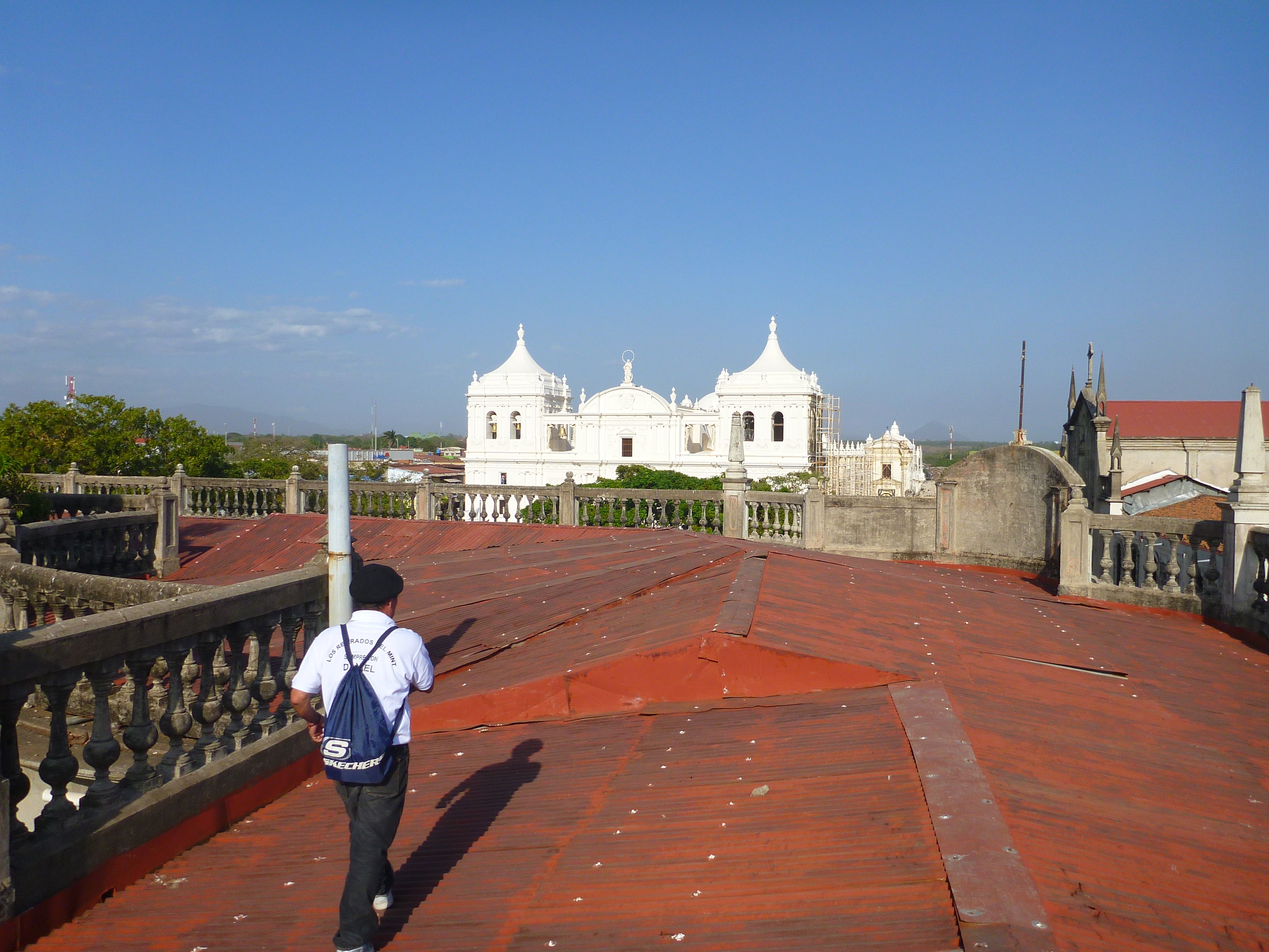Nous en parlions dans le premier article, mais nous sommes aujourd'hui allés voir de plus près cette immense cathédrale. En effet, après l'avoir visité de l'intérieur nous avons pu acheter un ticket (84 cordobas par personne, pour participer à la rénovation) qui nous autorise la visite des toits ! Nous voila donc comme Quasimodo, à nous promener sous les cloches, et profiter des vues sur la ville, et sur les volcans au loin, accompagnés de nos amis Ben et Tianna (toujours les mêmes).