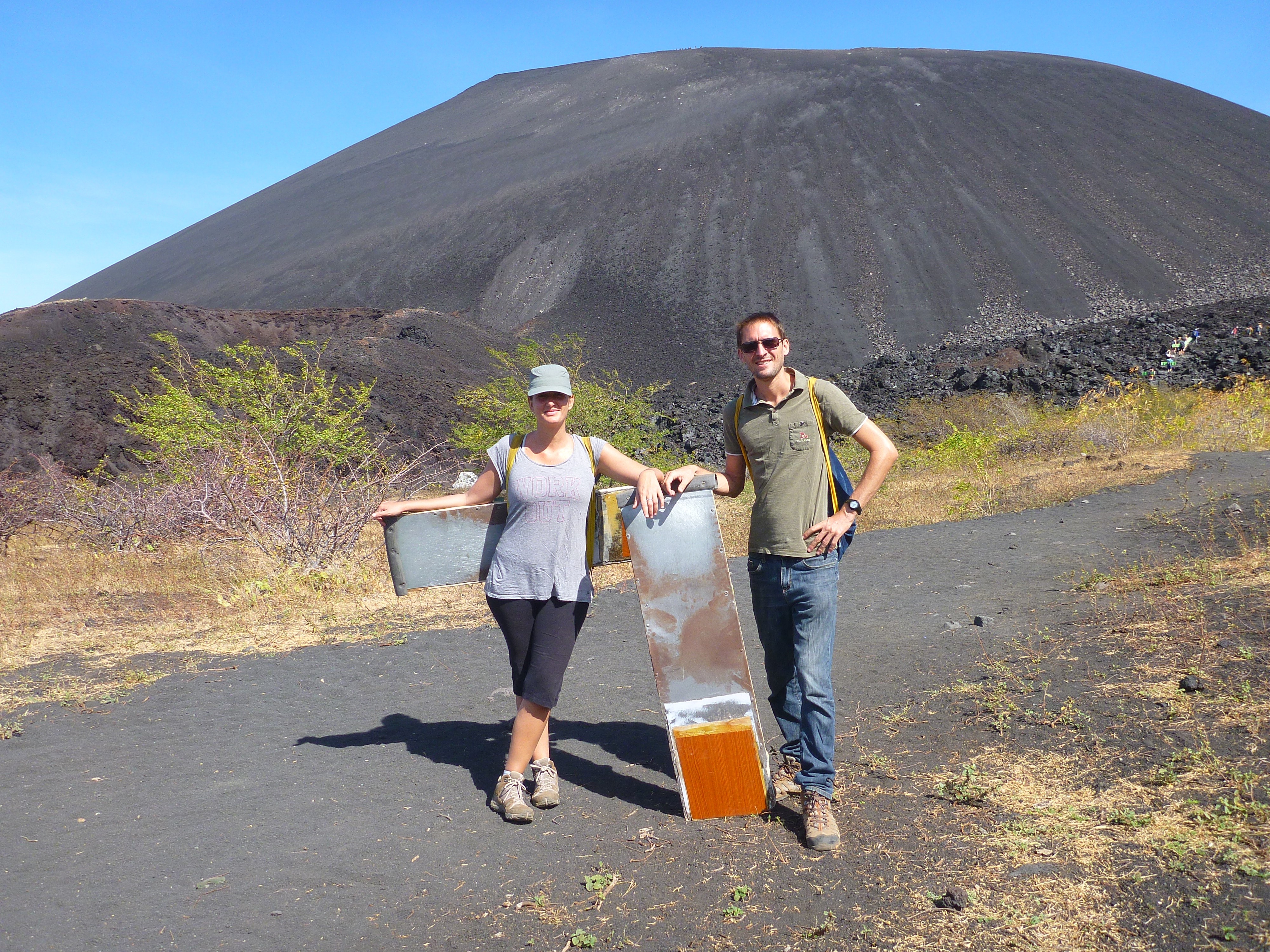 Mardi, nous avons grimpé le Cerro Negro, plus jeune volcan d'Amérique Centrale, et également le plus actif du Nicaragua (23 éruptions depuis sa naissance en 1850). L'ascension en 30 minutes jusqu'au sommet (728m) est assez facile, et offre des vues sur tout les alentours, de la côte pacifique (quelques dizaines de kms), à l'arrière pays, séparés par la chaine de volcans des la cordillère des Maribios (12 volcans bien alignés, dont 5 actifs, voire très actifs en ce moment). La particularité de ce volcan est que la plupart de ses éruptions provoquent une forte émission de cendres au niveau du cône, et de la lave à la base. Le volcan est donc très noir, constitué de roche volcanique, de la taille d'un grain de sable, à de de gros rochers. Cette spécificité a ouvert la porte à une activité bien originale : le volcano-boarding ! En effet, après l'ascension au sommet de 30 min, il nous a suffit de moins de 1 minute pour redescendre, en ligne droite, sur nos luges, munis de nos combinaison en jean, gants et masques. Il parait que les plus rapides atteignent 80 kms/h... Le cycliste Français de l'extrême Eric Barone détient encore ce jour le record de descente sur gravier en vélo prototype, record obtenu sur le Cerro Negro en 2002 (172 kms/h).