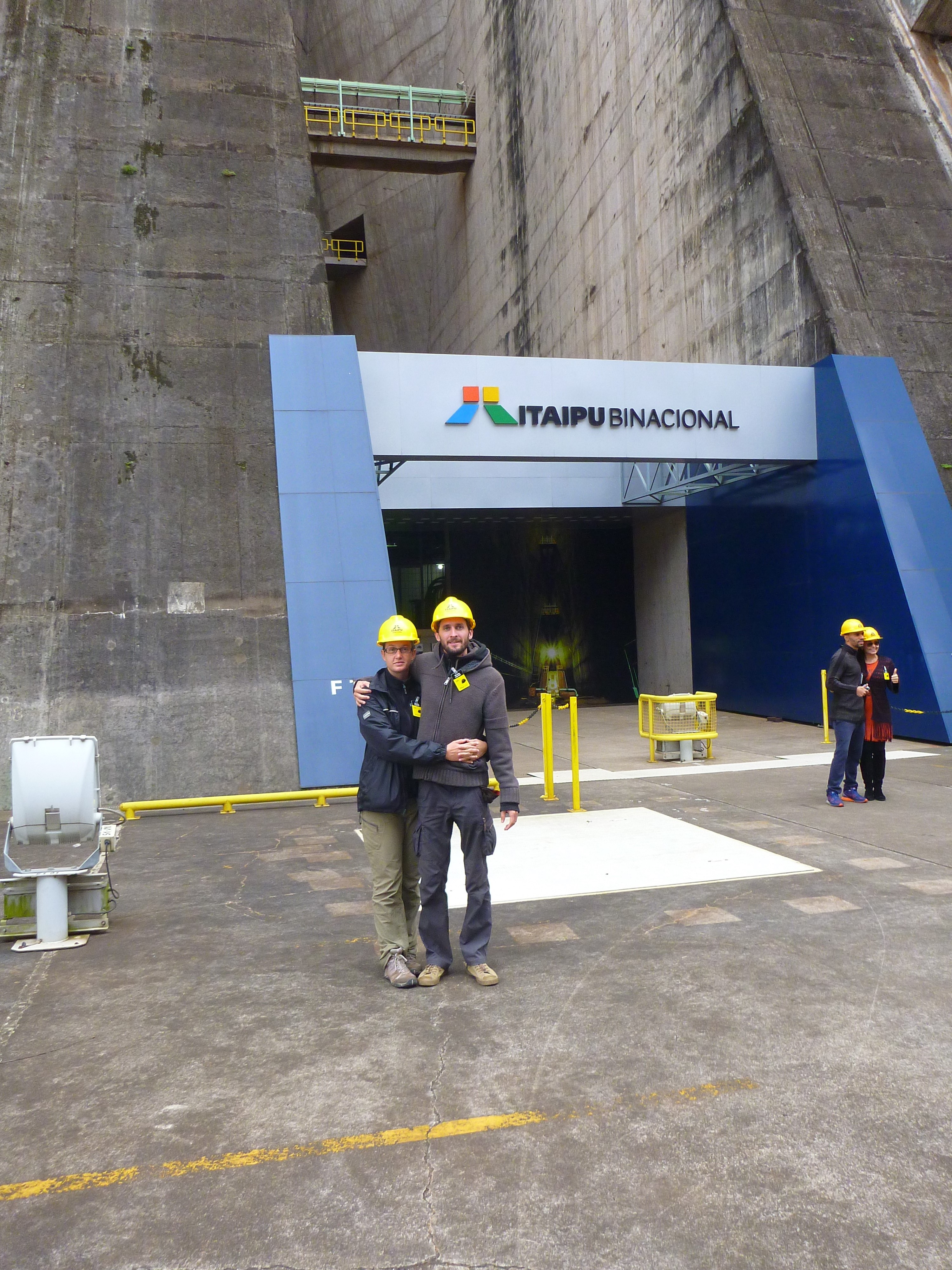 Nous avons commencé notre première journée au Brésil avec la visite du Barrage de Itaipu, une des 7 merveilles du monde moderne (rappelez-vous, le Canal de Panama en est une autre, et les 5 restants sont Le tunnel sous la Manche, la Tour CN de Toronto, l'Empire State Building, le Golden Gate bridge de San Francisco, et le Plan Delta du système de digue d'Amsterdam). Nous avions donc réservé la veille au soir 2 billets pour le "Tour Spécial" de 8h, une visite guidée en profondeur du barrage avec un groupe de 20 personnes. Et nous n'avons pas été déçu ! Après une visite en bus des quelques points panoramiques, nous sommes entrés dans les installations, qui produisent 14000 MW. Il faut savoir que ce barrage est installé sur la rivière Parana (7ème plus grand fleuve du monde), qui sépare le Brésil du Paraguay, et donc sur le barrage nous sommes sur un territoire Binacional. En effet, Brésil et Paraguay ont créé un territoire commun, géré par un traité ratifié en 1973, et ont partagé équitablement coûts et ressources pour la mise en place et l'exploitation du système. Aujourd'hui, avec ses 20 turbines, le barrage produit 90% de l’électricité du Paraguay, et 20% de l’électricité totale Brésilienne. Les 3000 employés sont bilingues, la moitié d'entre eux Paraguayenne, et l'autre Brésilienne. Les responsabilités sont équitablement partagées dans les salles de contrôles, où figurent une symbolique ligne jaune au sol, représentant la frontière fictive originelle entre les deux territoires : le milieu de la rivière Parana. Autre détail : le Paraguay utilise du 50Hz et le Brésil du 60. La moitié des turbines est donc en 50Hz et l'autre en 60Hz, mais un transformateur coté Brésilien converti du 50Hz en 60Hz, afin de pouvoir utiliser le surplus inutilisé par le Paraguay en 50Hz, qui le revend coté Brésilien. Bref, une visite intéressante de ce barrage de 7Kms, qui détient encore le record du monde de production cumulée d'énergie.