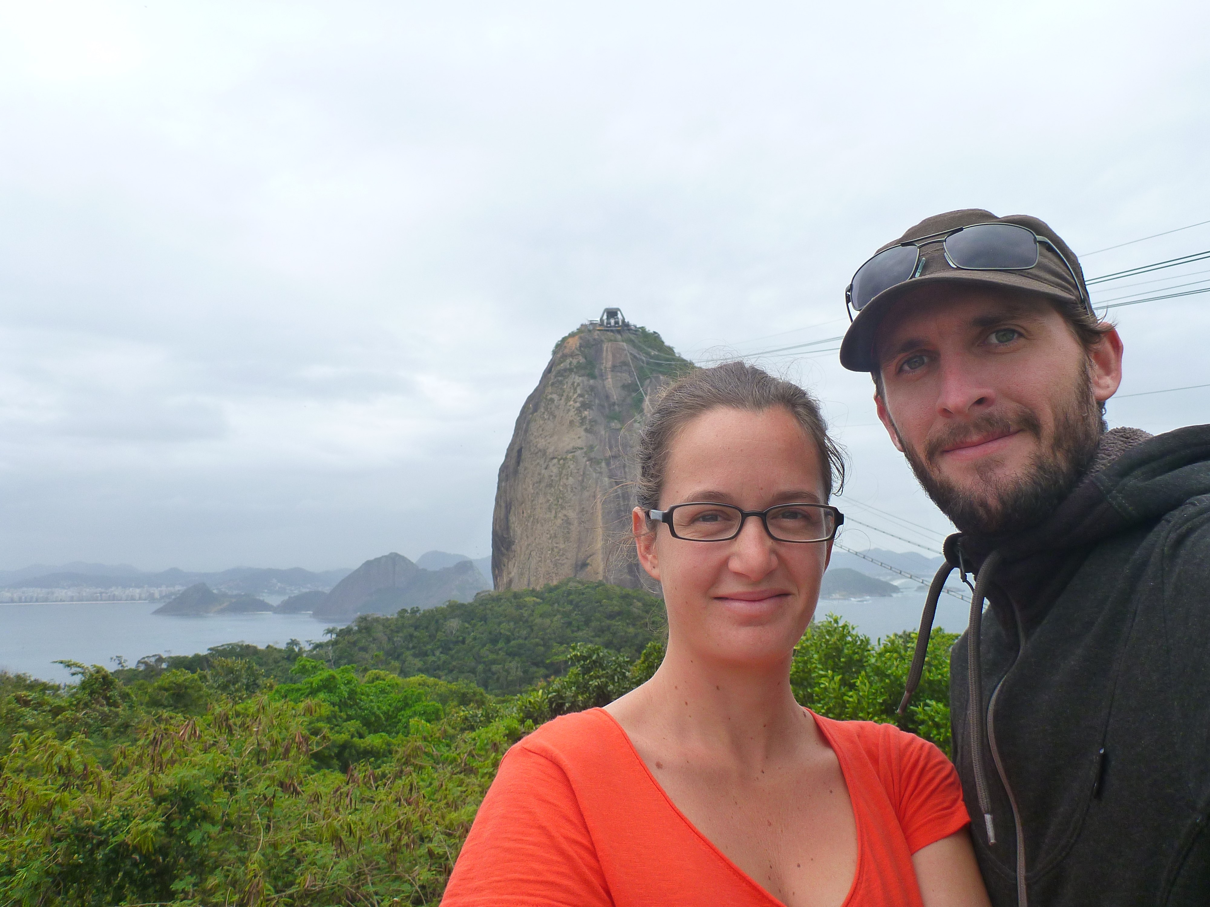 Mercredi, visite du Pain de Sucre ! Malgré le soleil qui a fait son timide toute la journée, nous sommes montés en haut du Pain de Sucre (20€ pour 2 téléphériques de 3min). L’icône de la baie de Rio est en effet immanquable. La vue au sommet y est imprenable, sur toute la baie, le centre-ville, et les plages de Copacabana. Même le Christ, perdu dans les nuages a bien voulu se montrer par intermittence, mais nous irons le voir de plus près demain. Culminant à 396m, il est accessible depuis 1912, lors de la mise en service du premier téléphérique, alors le 3ème au monde. Il a depuis été changé 2 fois, en 1972 et 2008, augmentant les capacités et vitesses de transport. Mais aujourd'hui, nous étions relativement peu au sommet, à croire que la ville ne compte que des amateurs/travailleurs des J.O. en ce moment...